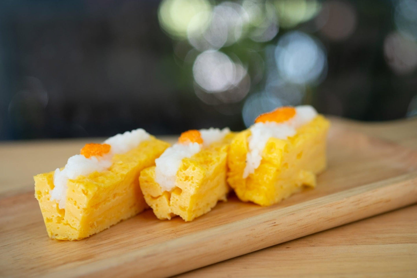 Once you’ve mastered making tamagoyaki, you can use it to make tamago sushi. Tamago sushi is comprised of a slice of tamagoyaki placed over a mound of sushi rice and is usually wrapped with a thin piece of nori seaweed. It’s commonly found in sushi restaurants, both traditional and conveyor-belt style, but why not try making it at home too?