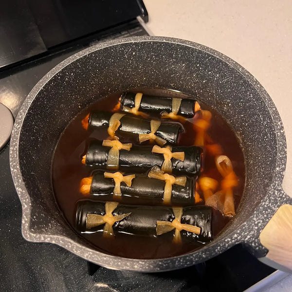 Regarding the Kombu Roll, it is believed that the word "Kombu" rhymes with "Yorokobu" (meaning happiness). Additionally, Kombu is thought to symbolize fertility and family prosperity due to its phonetic association in Kanji characters. Hence, Kombu rolls are a favored addition to Osechi.