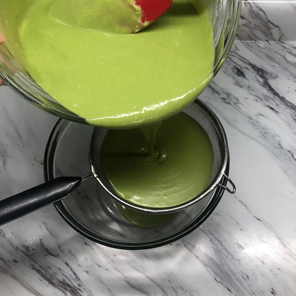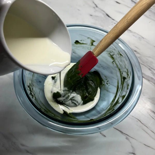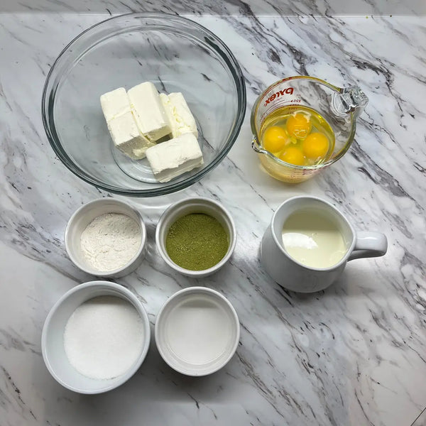 To make it, start by mixing cream cheese until smooth. Then add sugar, eggs, heavy cream, and a bit of flour. Don't forget to sift the matcha to avoid lumps. Pour the batter into a pan and bake until it's golden and crispy.