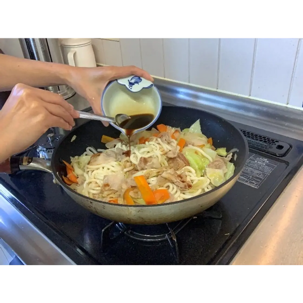 The seasoning for Yaki Udon varies by household and region. Some versions use a thick, deeply flavored sauce, while others rely on a lighter soy sauce base or an umami-rich dashi seasoning. Pork is the most common protein, but shrimp or squid are also popular alternatives and are widely enjoyed in Japan.