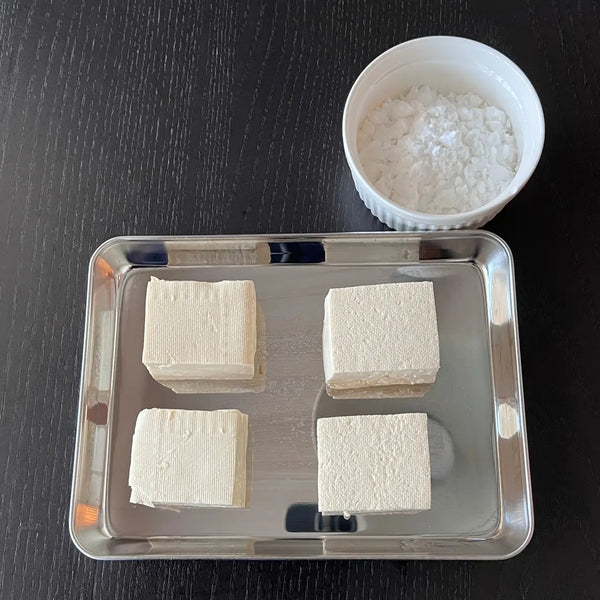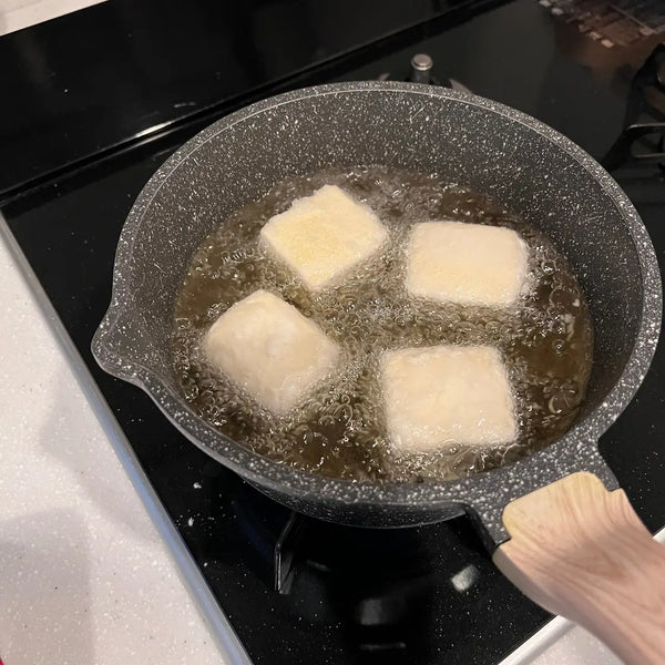 When making agedashi tofu, you cover the tofu with potato starch or all-purpose flour, then deep-fry it and make japanese fried tofu and finish it with Japanese dashi soup or a soy sauce-based sauce. Coating the tofu with powders and deep-frying it enhances the taste and texture of the tofu.