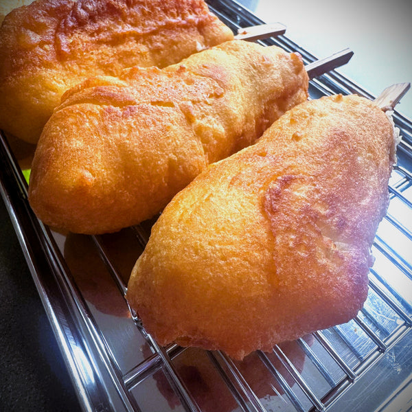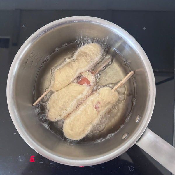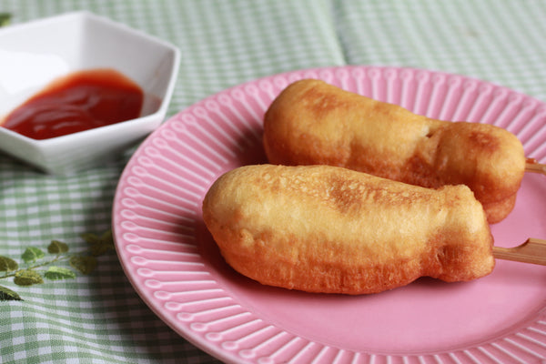 The American corn dog, known in Japan as "American dog," is a popular deep-fried snack featuring a juicy hot dog coated in a sweet and savory cornmeal batter. This crispy treat is beloved in both the U.S. and Japan, where it is commonly found at festivals, convenience stores, and food stalls.