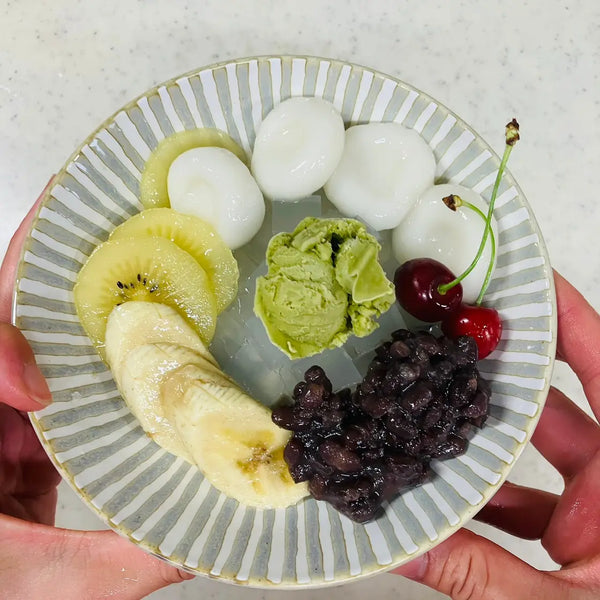 Anmitsu is a traditional Japanese summer dessert, consisting of small cubes of semi-translucent agar jelly, known as Kanten in Japanese, which is made from red algae, making it plant-based.