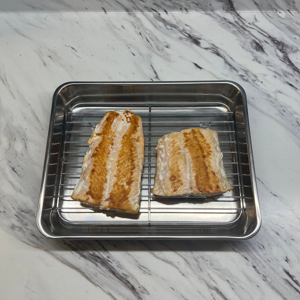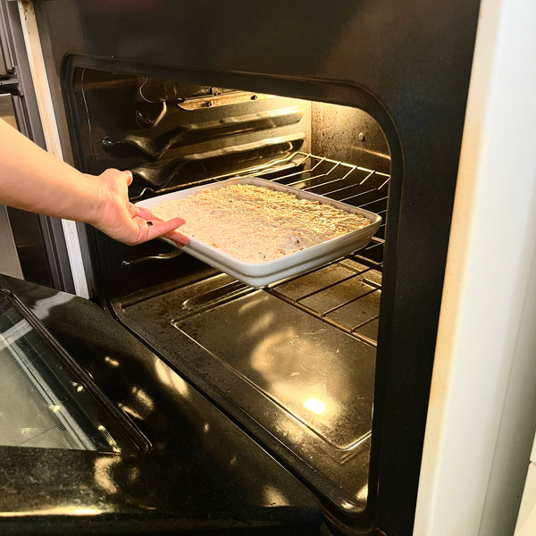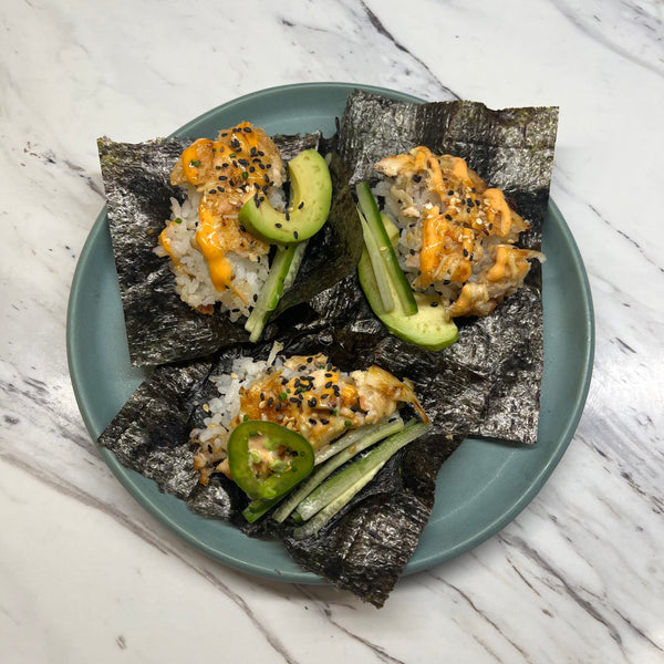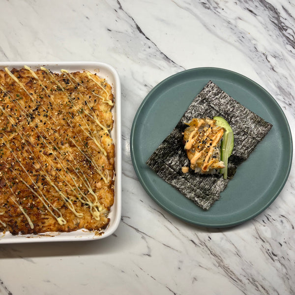 Once the mixture is spread evenly over the rice (an ice cream scoop helps with this), the whole dish is baked until the top is golden and lightly crisped. It’s then scooped onto small pieces of nori and eaten like a mini hand roll. You can also serve it with fresh cucumber, avocado, pickled ginger, or jalapeño on the side for extra flavor and kick.