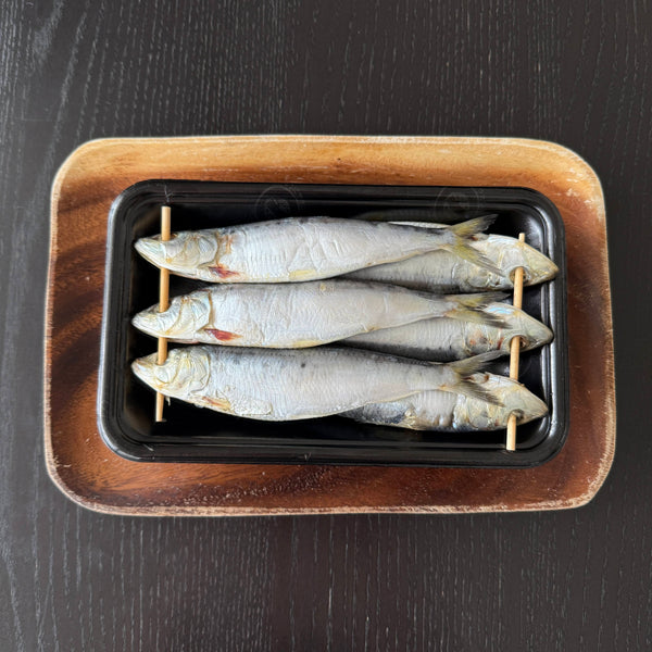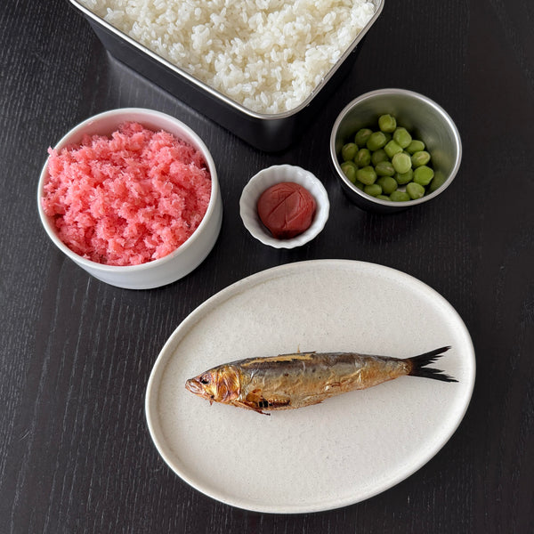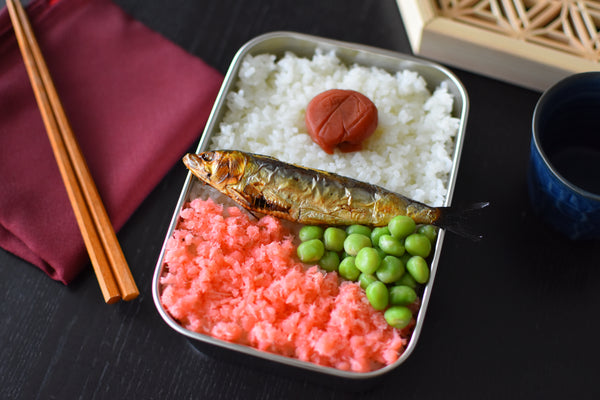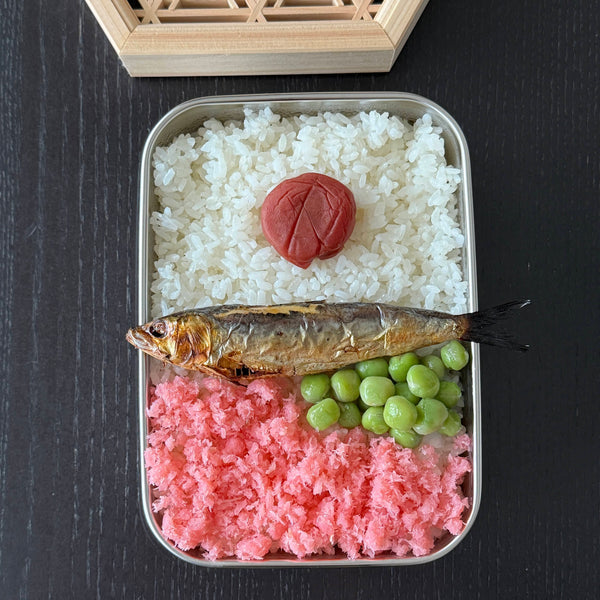 The protein in the bento is mezashi, a type of grilled dried sardine. This was a typical, budget-friendly protein choice in the mid-20th century. Paired with this are green beans, specifically ao-endo-mame, which you can substitute with edamame if they’re easier to find. The green adds color and a subtle, earthy taste that balances the flavors.