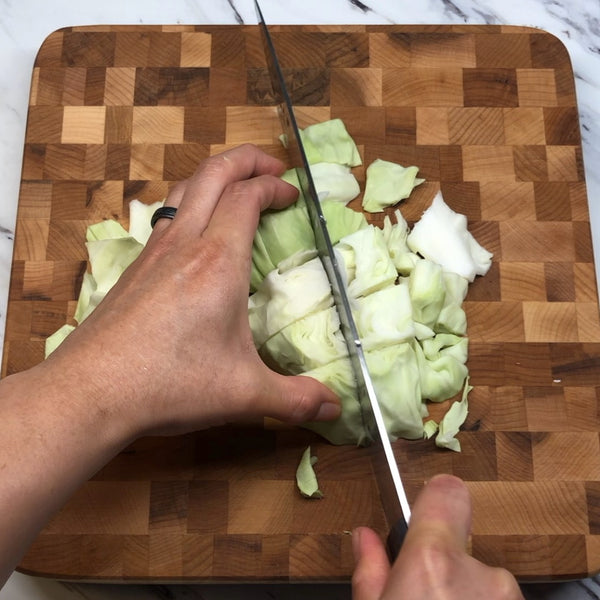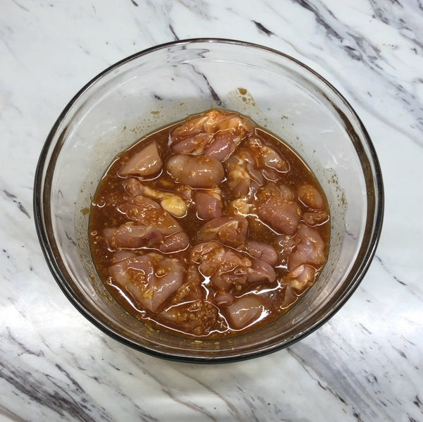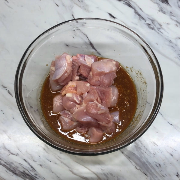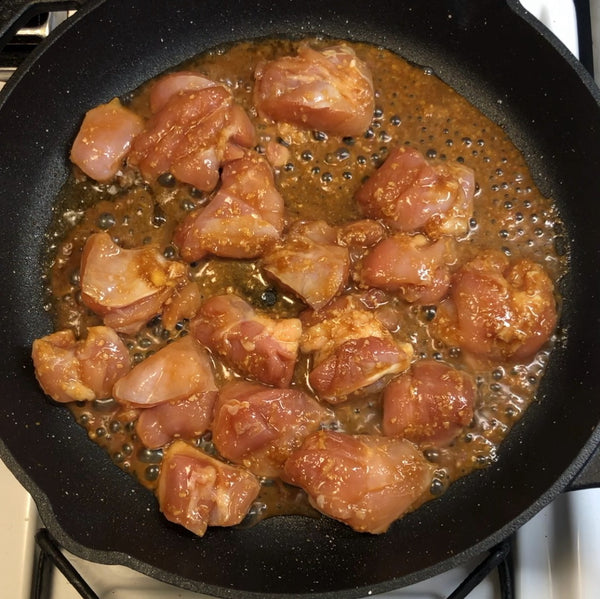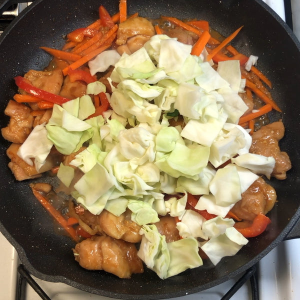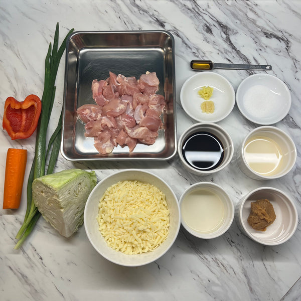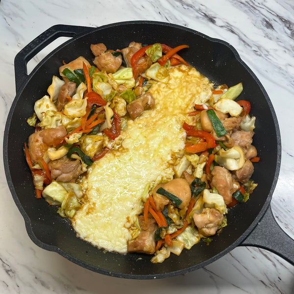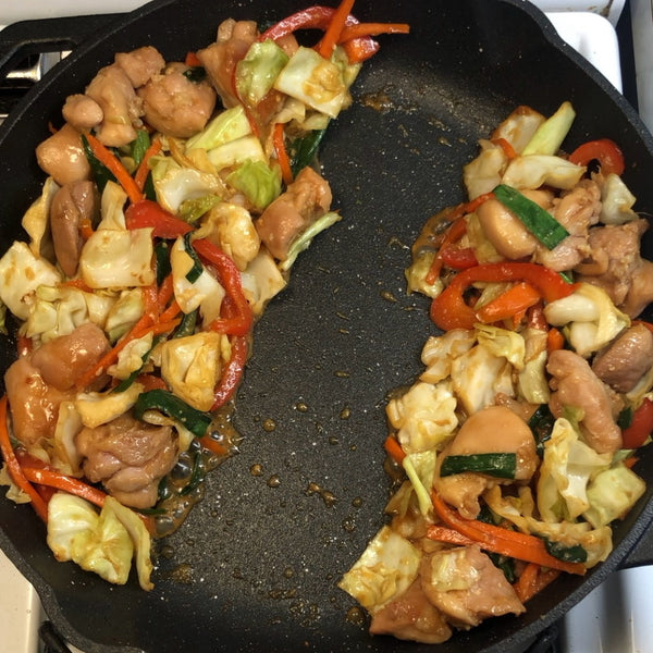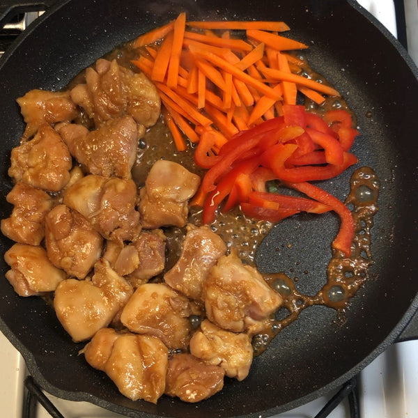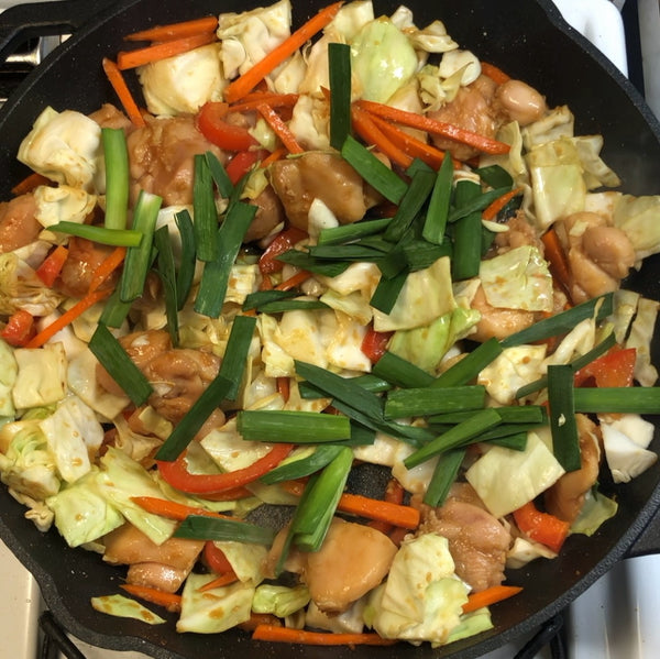 Our Japanese-style recipe uses tender chicken pieces and a colorful mix of vegetables, including sweet carrots, earthy nira (garlic chives), crunchy cabbage, and a bit of red pepper for balance, all cooked together until everything is coated in that rich sauce.