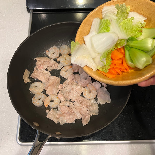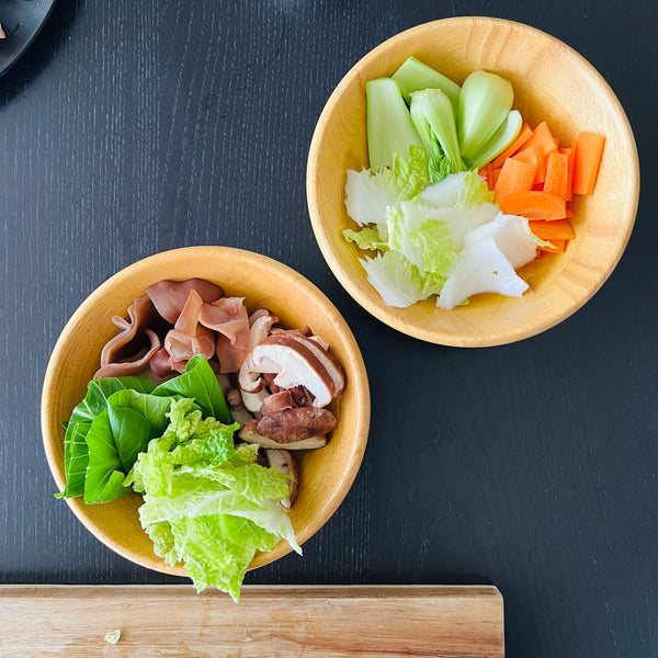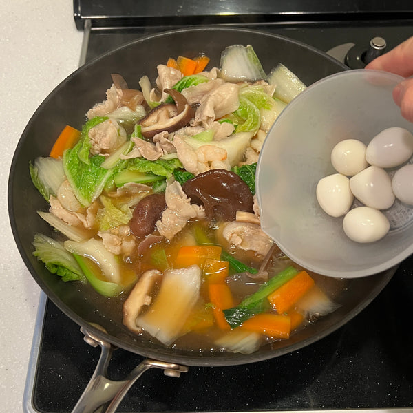 Though the combination of ingredients can vary, chukadon typically includes pork, seafood like shrimp and squid, vegetables such as carrots, Chinese cabbage, and wood ear mushrooms, and boiled quail eggs. You can also customize it with other ingredients like young corn, green peppers, shiitake mushrooms, or bamboo shoots.