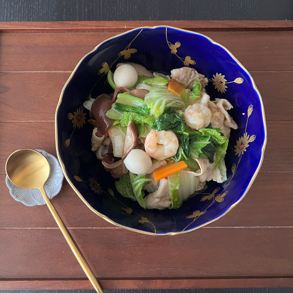 The dish originated from the Chinese recipe "happosai," where meat, seafood, and vegetables are seasoned and coated with a rich sauce. Around the beginning of the Showa period, the Japanese adapted it by serving happosai over steamed rice in a single bowl, calling it "chukadon," meaning "Chinese-style donburi" in Japanese.