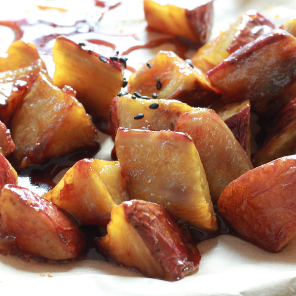 Daigaku Imo requires only a few simple ingredients: sweet potatoes, sugar, mirin, soy sauce, and oil for frying. It’s common to sprinkle black sesame seeds on top, not only for presentation but also to add a nutty flavor and a crunchy texture.