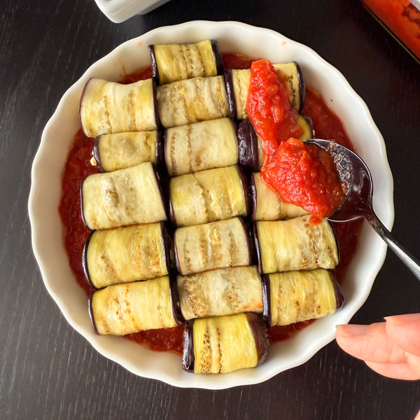 Eggplant Rollatini – This Italian-American dish is inspired by the classic Italian “Involtini di Melanzane.” Eggplant slices are rolled with ricotta (sometimes other cheeses) and herbs, then baked with marinara sauce. Cooking methods vary by household; some bread and deep-fry the slices, while others sauté or pan-fry them for a lighter version—perfect for an appetizer. In this recipe, we use Japanese eggplants with a simple oven-baked method, delicious both hot and cold.