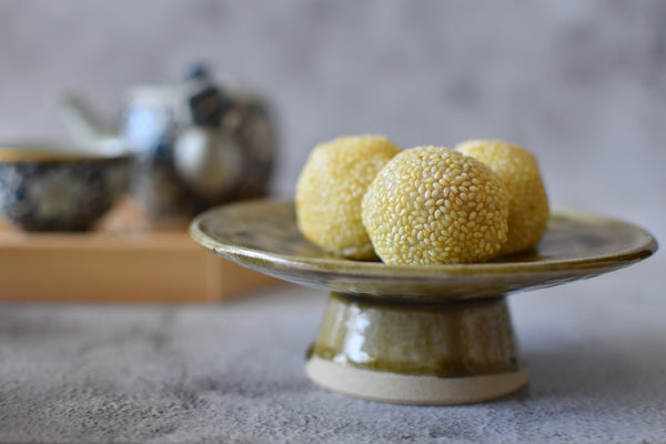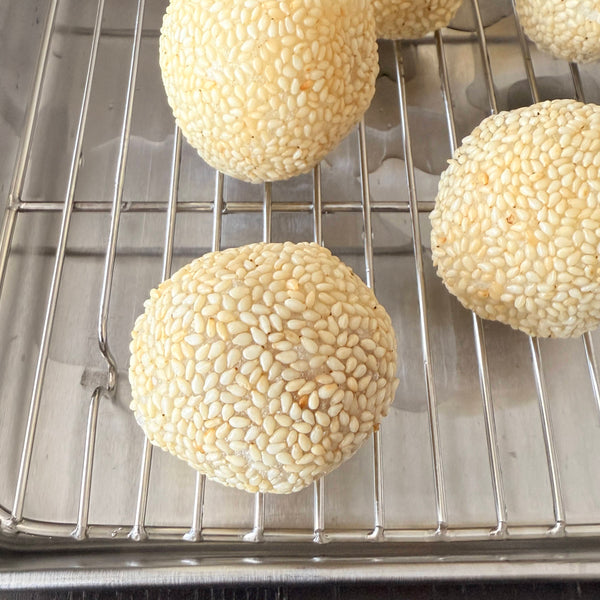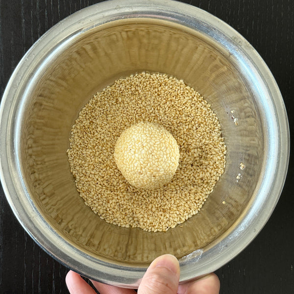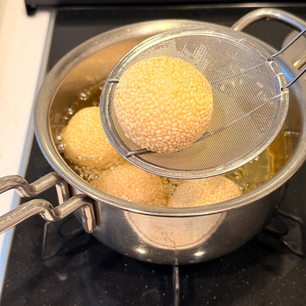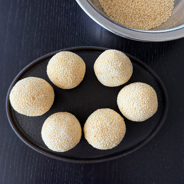 Although goma dango is popular in Japan, it actually originated in China during the Tang Dynasty. There, it is known as zhīmáqiú (芝麻球) or, in Cantonese regions, jian dui (煎堆), and is often filled with lotus seed paste, peanut paste, or red bean paste. The round shape symbolizes completeness and unity, while the golden color represents wealth and prosperity, so these sesame balls are commonly enjoyed during celebrations for good luck.