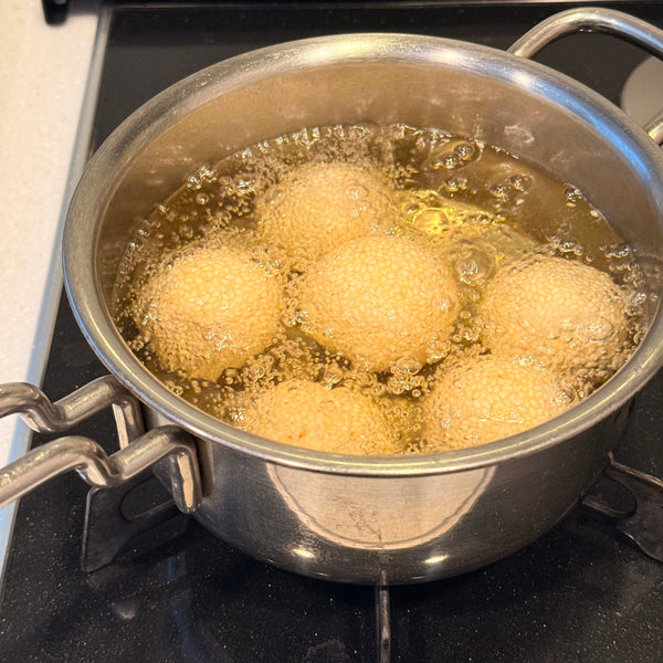 Goma dango tastes best when freshly deep-fried, so enjoy them hot or warm. If they firm up, reheat in the microwave or a toaster oven. For leftovers, freeze them by wrapping each ball individually and storing them in an airtight container or freezer bag. Reheat in the microwave before serving.