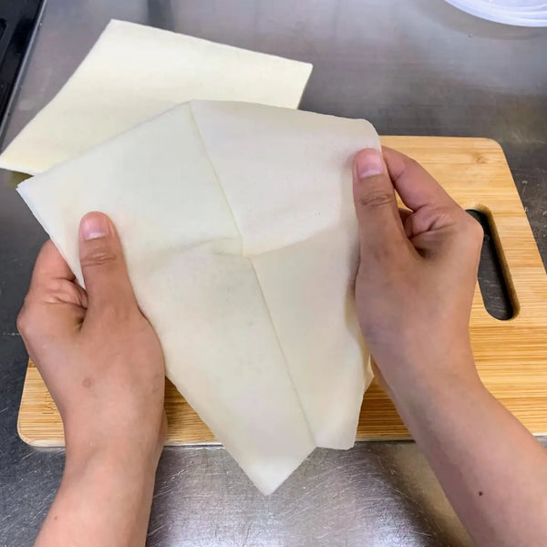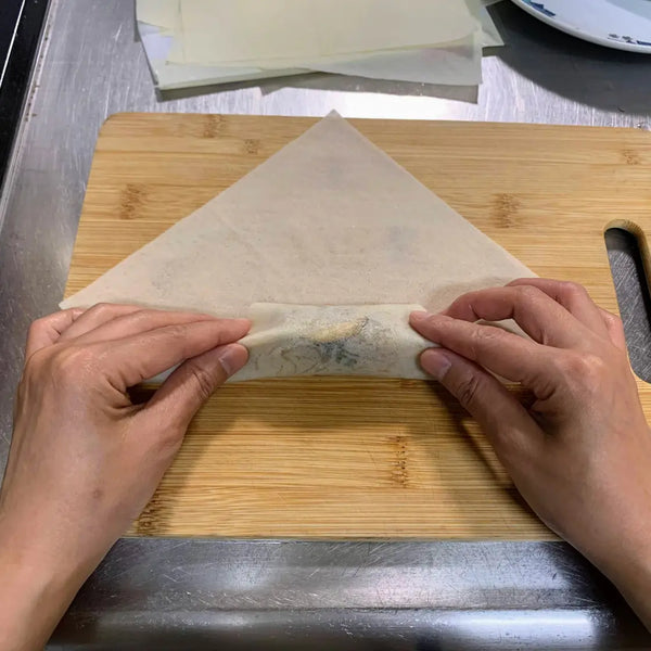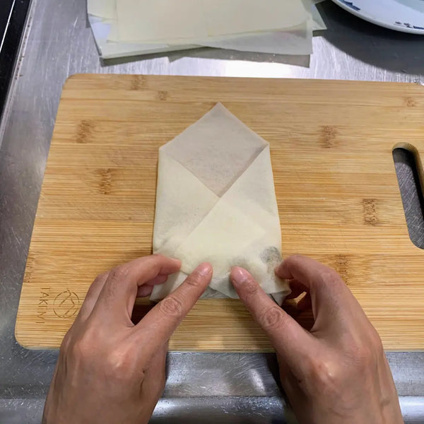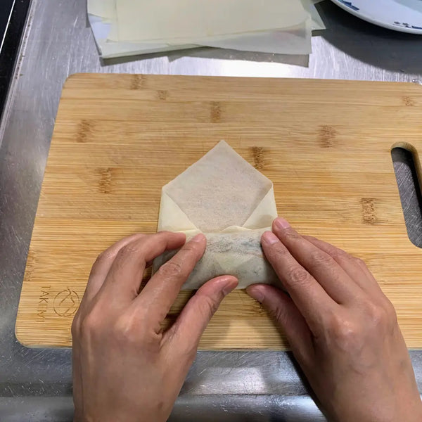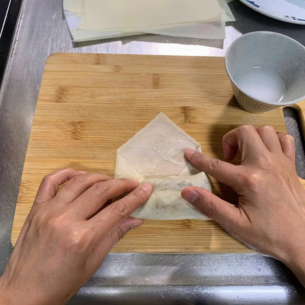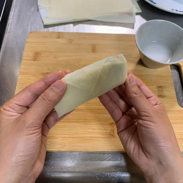 Next, fold in the left and right corners to create a pocket, and continue to roll the egg roll away from you until you reach the top corner. Before sealing, lightly wet the top corner with water to help it stick. This technique ensures that your egg rolls are securely wrapped and ready for frying or baking, making it easy to enjoy delicious homemade harumaki!
