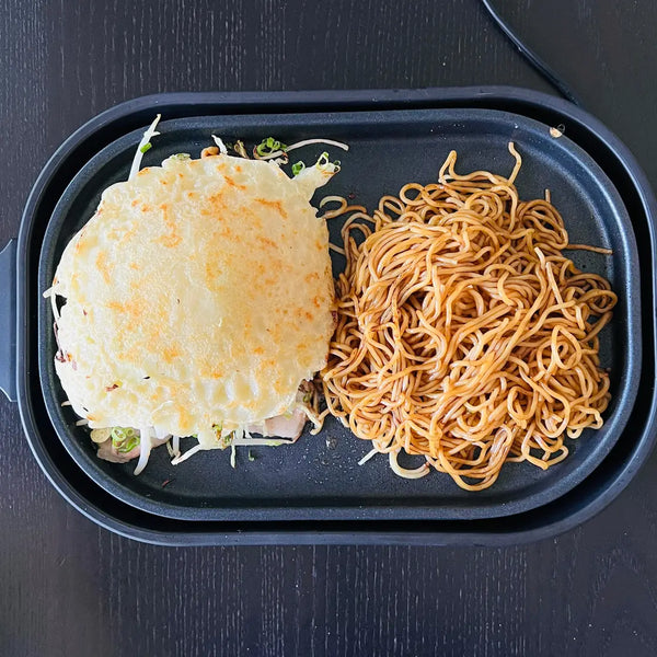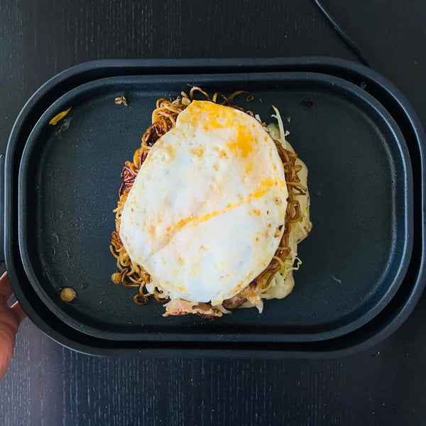 An iconic addition to Hiroshima-style Okonomiyaki is stir-fried noodles or yakisoba. This ingredient contributes to its substantial and satisfying appeal.