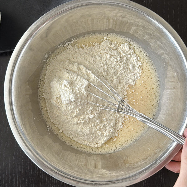 The ingredients are quite simple. While you can use regular flour, I used a hot cake mix. These convenient mixes typically contain flour, sugar, skim milk powder, fat, oil, baking powder, and vanilla flavoring. They simplify preparation by removing the need for sieving or adding extra ingredients. In Japan, hot cake mix is far more than pancake batter. It is a versatile ingredient that exceeds expectations, so trying a Japanese hot cake mix is well worth it.