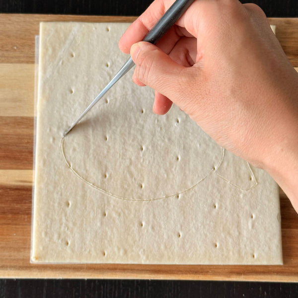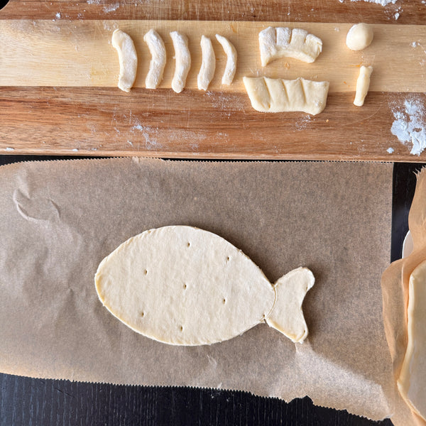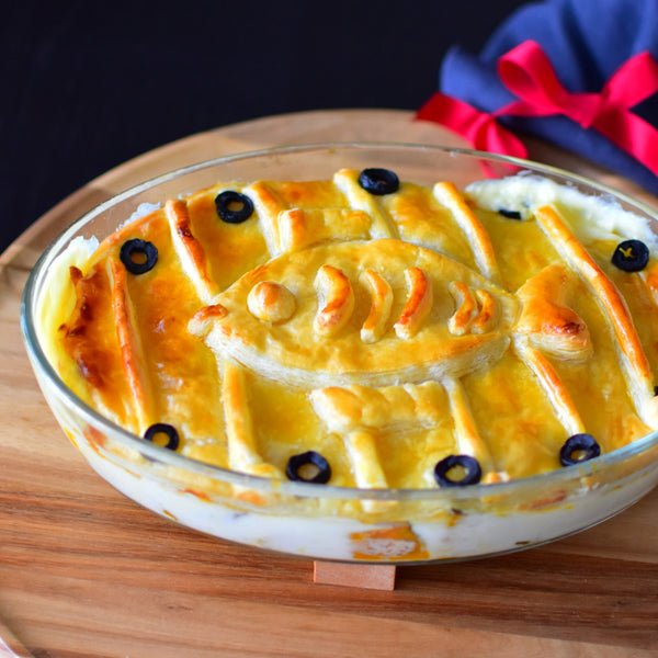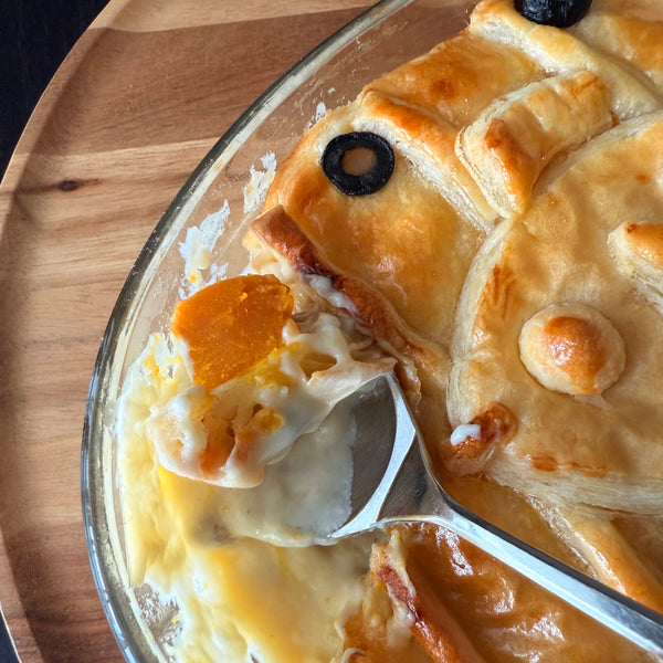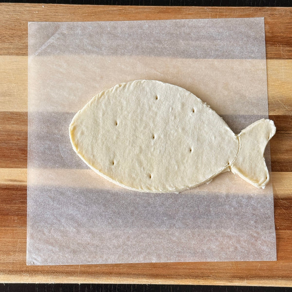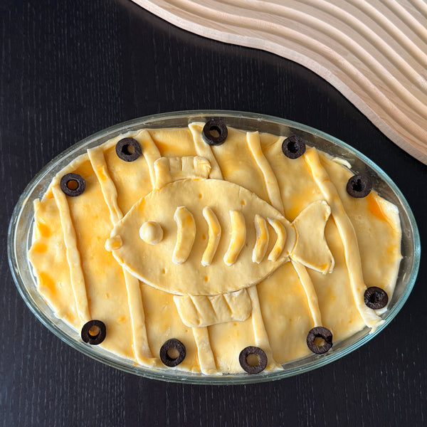 Though I’ve added some shortcuts to simplify the process, one step you can’t skip is decorating the pie with a fish design. I used a sharp knife to trace and cut out the fish shape before the puff pastry softened, ensuring a crispy, flaky crust. It’s a bit tricky but definitely fun.