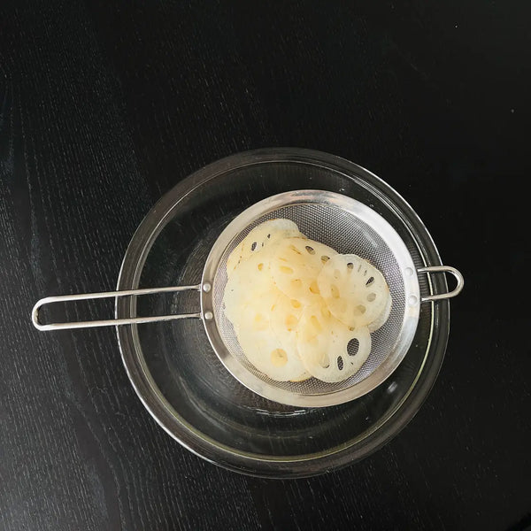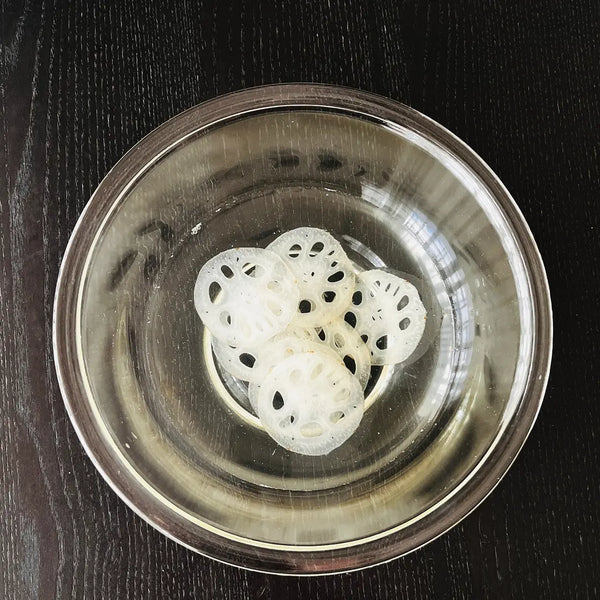 Slice the lotus root into 1-2mm pieces. Use a mandoline if you have one. Put the sliced lotus root pieces into the vinegar water and let them soak for 5-10 minutes.