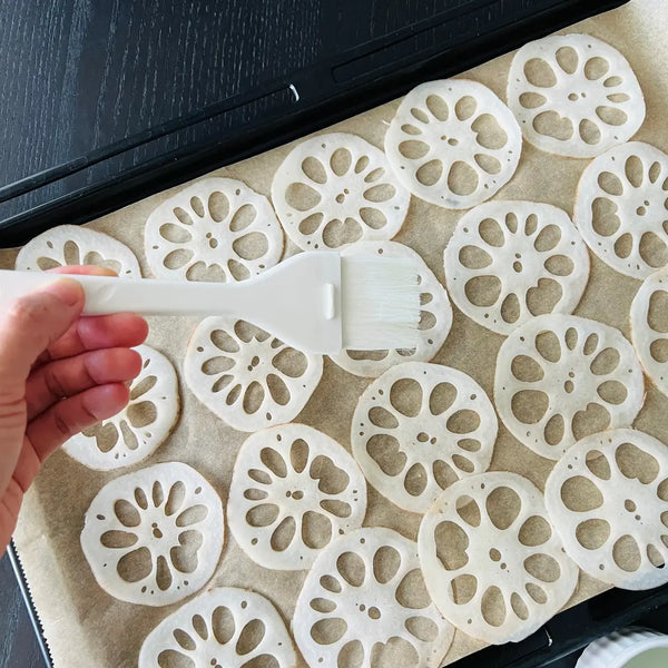 Prepare lotus root the same way until step 2. Place lotus root pieces onto a baking sheet lined with parchment paper. Spread some oil onto the surface of the lotus root pieces with an oil brush.