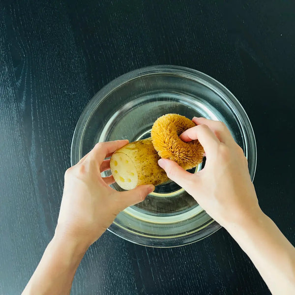 Wash the lotus root gently with a Tawashi as we will be using the whole lotus root without peeling off the skin.