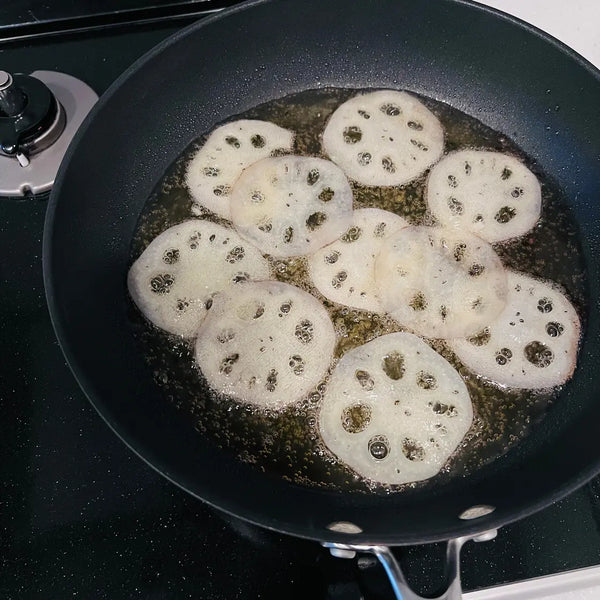 Add a neutral cooking oil to a pan or wide pot over medium heat. When it reaches 180℃, add the sliced lotus root pieces one by one and spread them evenly across the pan to create a single layer. Don’t add all of the lotus root pieces at once.