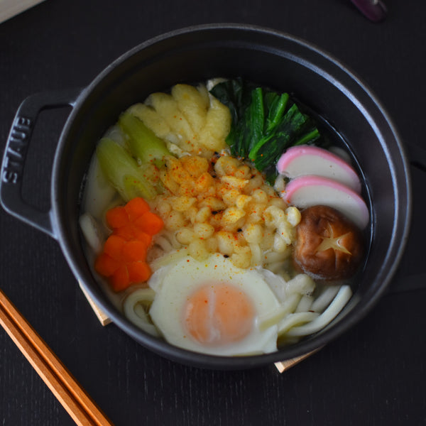 Traditionally, nabeyaki udon is made with thick udon noodles and various toppings such as kamaboko fish cake, shiitake mushrooms, deep-fried tofu pouch, egg, and more, all simmered in a savory dashi and soy sauce-based broth.