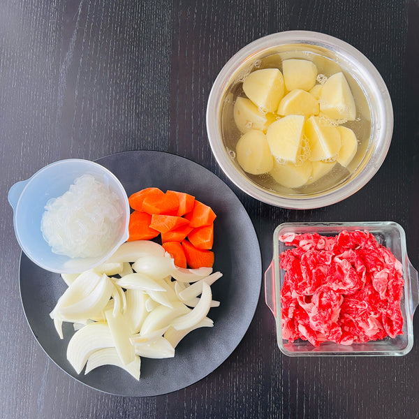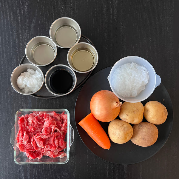 As you can see, it is made with meat and vegetables, which are simmered in a pot with sweetened soy sauce-based seasonings. The most important ingredients are “meat (Niku in Japanese)” and “potato (Jagaimo in Japanese)”, which lead to the name of the dish. Other than these two ingredients, we usually add onion (which adds sweetness), carrot (which adds color and sweetness), and sometimes Shirataki noodles (which add a chewy texture). These ingredients are accessible and usually stocked at home, meaning you can make Nikujaga anytime you want!