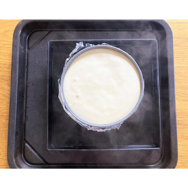 Add enough water into the water bath, so that it does not all evaporate during the baking time.