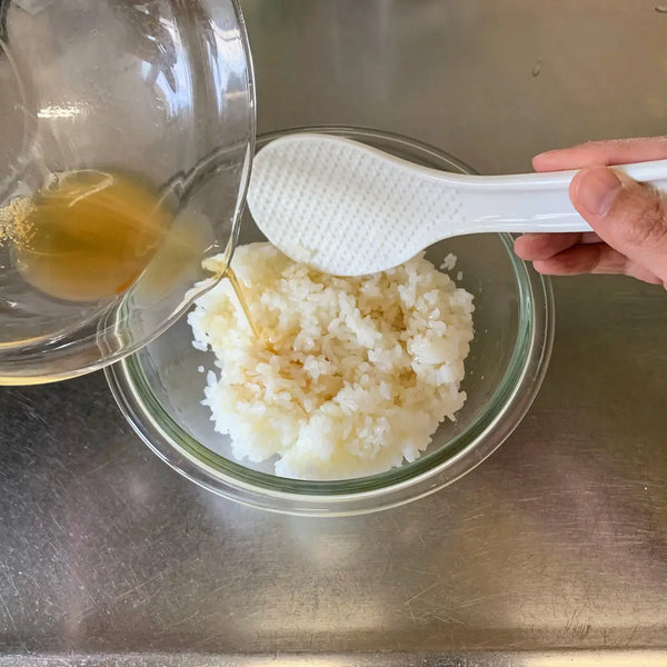 Use a fan to cool the rice while simultaneously distributing the seasoning mixture into the rice. This will help the seasoning to easily incorporate into the rice and will prevent it from becoming too sticky. Then, it's ready to use.