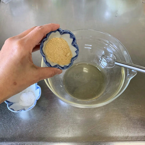 Combine the salt and sugar into the rice vinegar and mix until the sugar has completely dissolved.