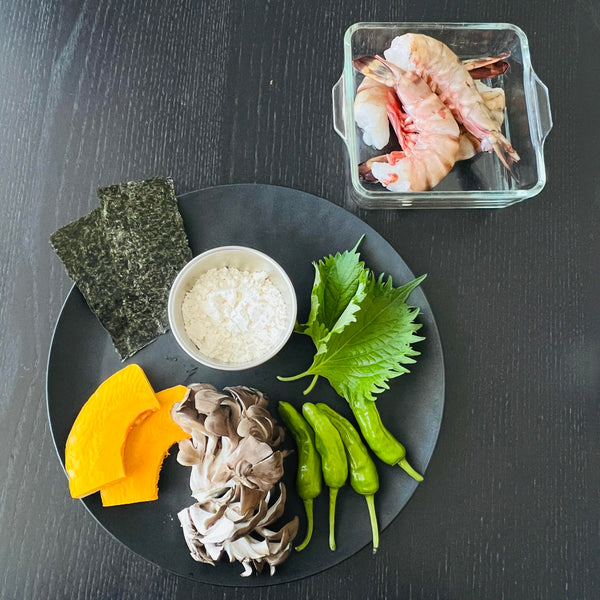 - Vegetables: Shishito peppers, shiso leaves, pumpkin, eggplant, and lotus root.
