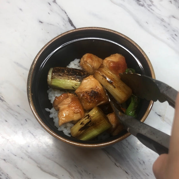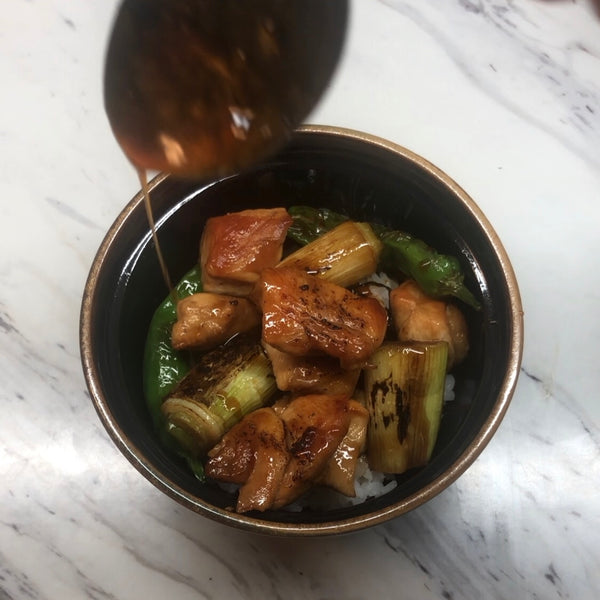 Yakitori don is a classic Japanese rice bowl dish that features grilled, skewered chicken served over a bed of steamed white rice. The chicken, known as yakitori, is traditionally cooked over a charcoal grill, imparting a smoky, slightly charred flavor.