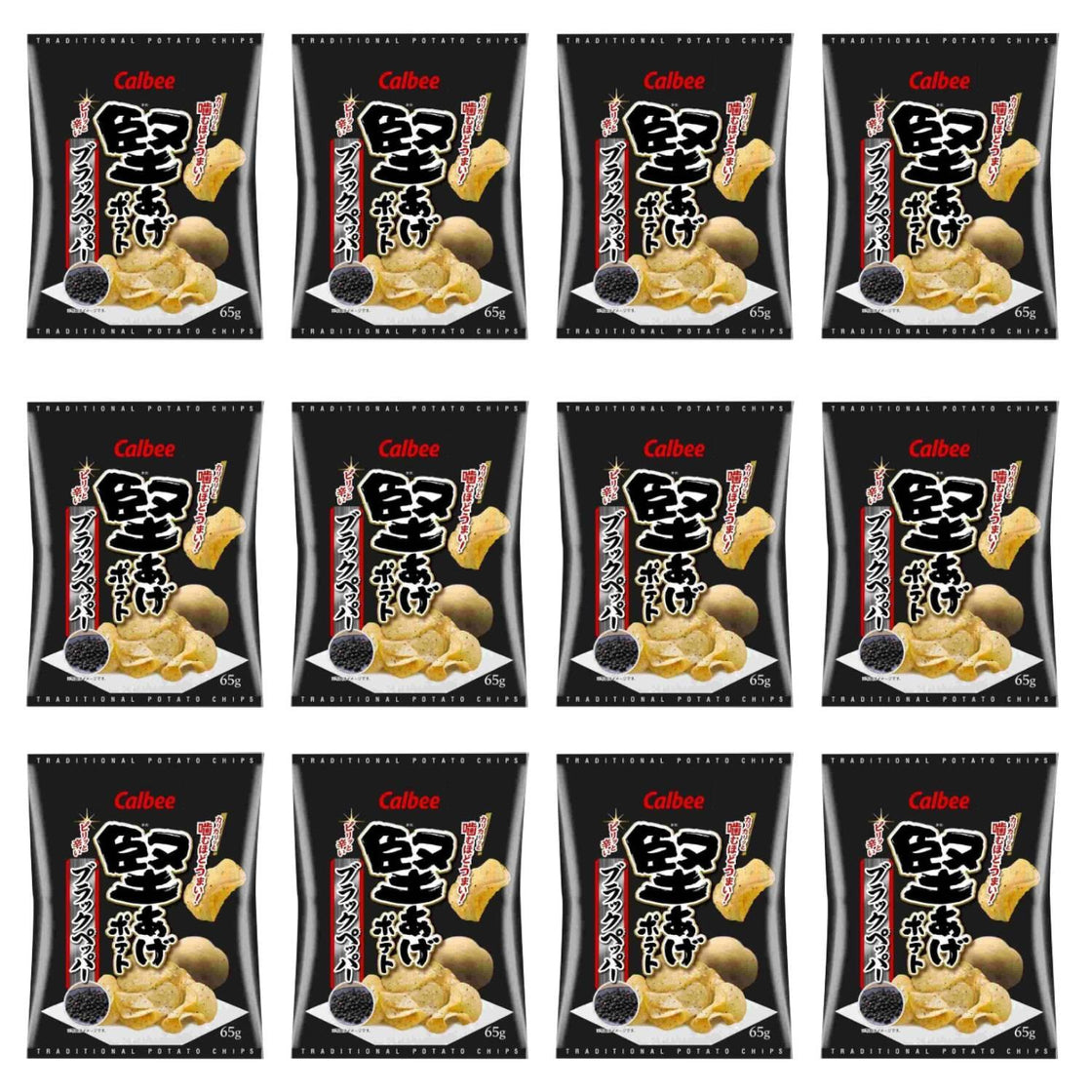 Calbee Kataage Potato is one of the Japanese potato chip series characterized by a hard, crunchy texture and great thickness. These black pepper chips are deep fried and then seasoned with salt and black pepper.