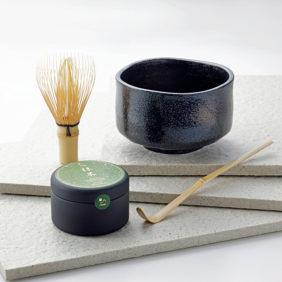 - Four piece set including: ceremonial-grade matcha powder, bamboo chasen, bamboo chashaku, handmade chawan