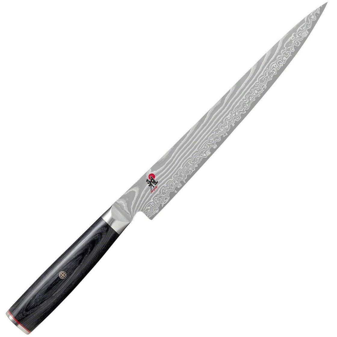 The MIYABI series is owned by a globally known kitchenware brand Zwilling J.A. Henckels. When Japanese traditional swordsmanship and German state-of-art technology combine, these bring about the creation of high-quality kitchen knives. This is the Damascus steel sujihiki knife.
