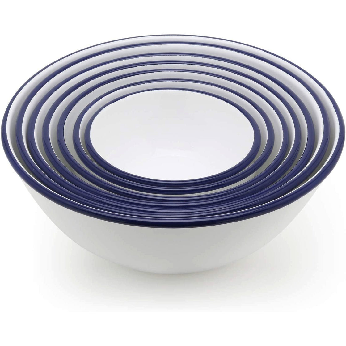 A series of white enamel bowls with navy blue detailing that come in seven different sizes. These bowls are both elegant and hold purpose, and will make your kitchen feel even more beautiful and stylish.