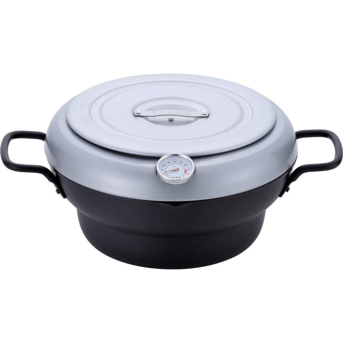 It comes with a thermometer to monitor and control the right oil temperature, a mesh to drain-off the left oil from cooked tempura and a flat lid to pile up another pot on the top and save some storage space.
