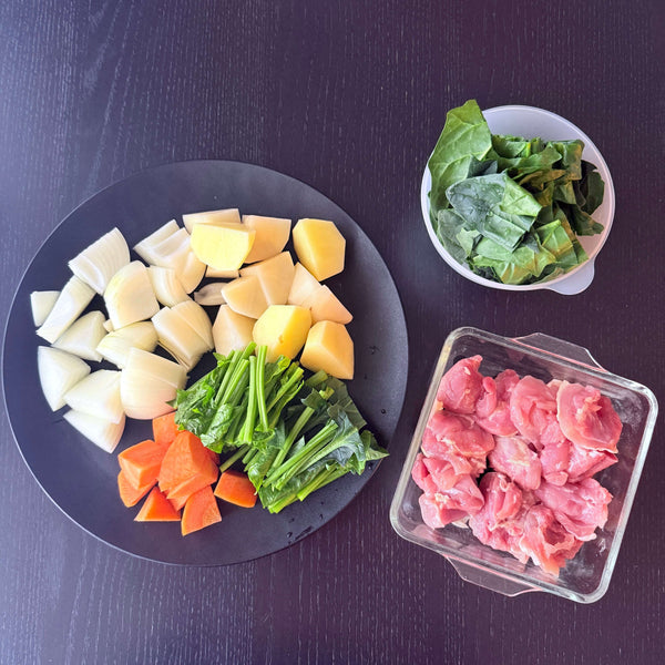 Vegetables (Onion, Carrot, Potato, Spinach) - Onion adds sweetness and umami, while carrot brings vivid color. Potatoes become silky and add a rustic touch, and spinach gives melty leaves with crunchy stems.