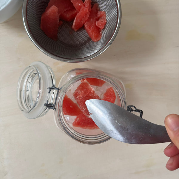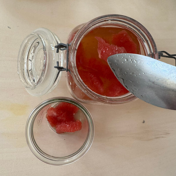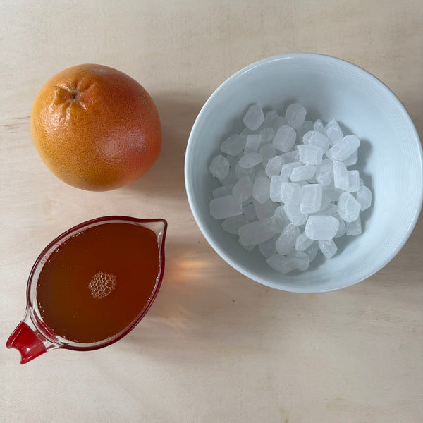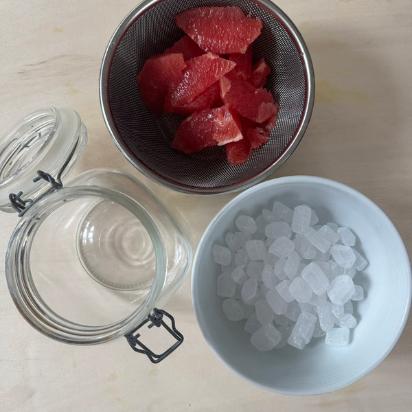 For a faster alternative, skip the resting process and use Tokiwa Japanese Drinking Vinegar Pink Grapefruit instead. It already combines grapefruit juice, apple cider vinegar, sugar, and honey into a ready-to-use base. Simply dilute about 5× with sparkling water to make an instant grapefruit spritzer.