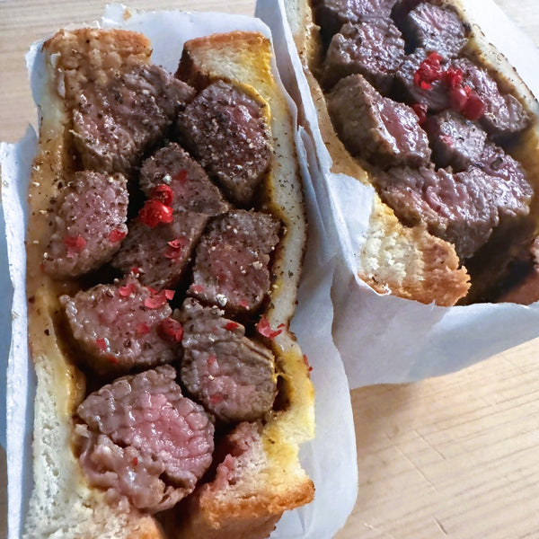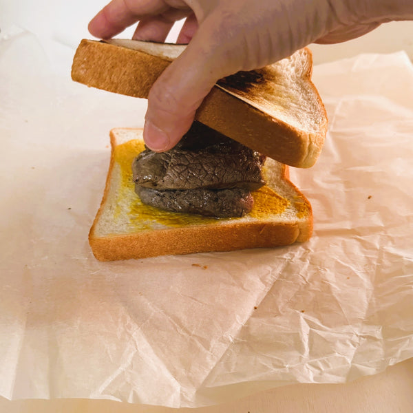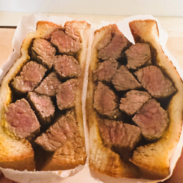 Wrap the sandwich in wax paper to maintain shape and make slicing clean and easy. Best enjoyed immediately, but leftover sandwiches can be stored in an airtight container in the refrigerator for up to 1 day. Reheat gently to preserve the rare steak texture and fluffy bread.