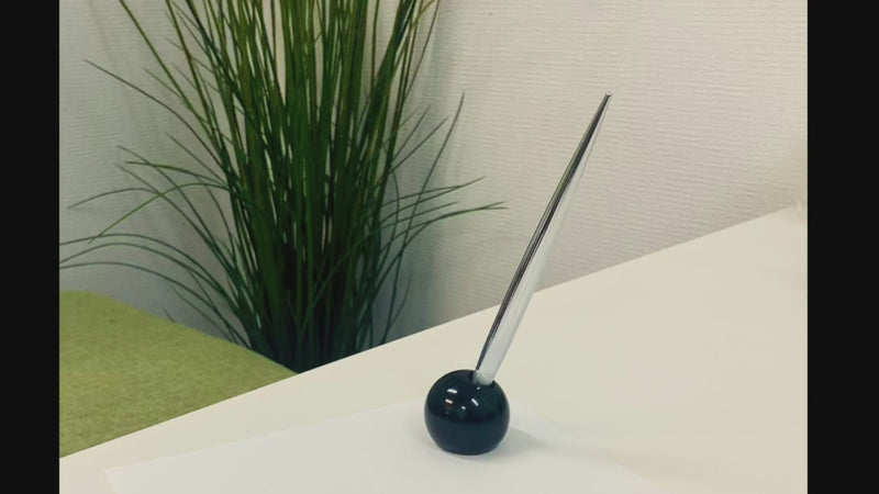The heavy, black, ball-shaped stand sits secure on any desk or table, and the fine and elegant chrome pen sits safely inside it. The pen itself features a sharp curve, becoming very narrow at the top, adding a touch of modernity to this classic design.